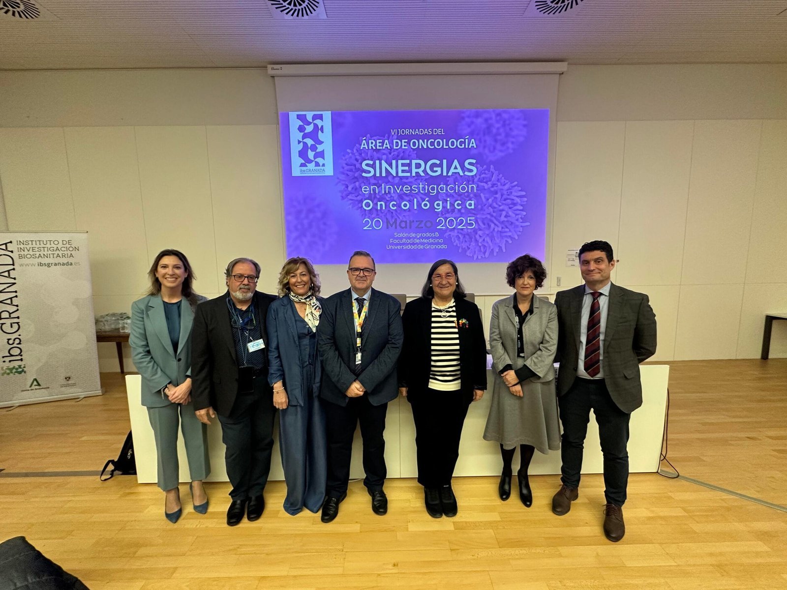 El Instituto de Investigación Biosanitaria de Granada (ibs.GRANADA) ha celebrado la VI Jornada del Área de Oncología bajo el lema «Sinergias en Investigación Oncológica». El evento, que ha tenido lugar en el Salón de Grados B de la Facultad de Medicina de la Universidad de Granada, reunió a destacados profesionales sanitarios en el campo de la Oncología, así como a investigadores clínicos y básicos y asociaciones de pacientes, con el objetivo de compartir avances en la investigación del cáncer y fomentar la colaboración multidisciplinar. La jornada fue inaugurada por la secretaria académica de la Facultad de Medicina, la Dra. María Isabel Núñez, el director médico del Hospital Universitario Virgen de las Nieves, Dr. Manuel Liñán; el director gerente del Hospital Clínico San Cecilio, Dr. Manuel Reyes Nadal y la directora científica del ibs.GRANADA, Dra. María José Sánchez Pérez, quien destacó la importancia de estos encuentros: «La investigación oncológica es un pilar fundamental para mejorar la prevención, el diagnóstico y el tratamiento del cáncer. Desde el ibs.GRANADA, seguimos apostando por la colaboración entre investigadores básicos y clínicos para generar conocimiento aplicable a la práctica asistencial y mejorar la calidad de vida de los pacientes.»