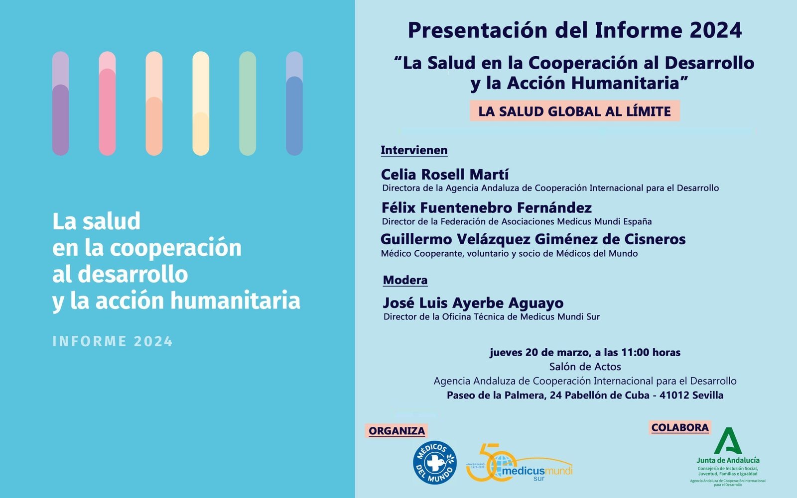 El próximo jueves 20 de marzo se presenta en el salón de actos de la Agencia Andaluza de Cooperación Internacional para el Desarrollo, en Sevilla, el informe 2024 “La Salud en la Cooperación al Desarrollo y la Acción Humanitaria”. En dicha presentación intervendrán como ponentes Celia Rossel Martí (Directora de la Agencia Andaluza de Cooperación Internacional para el Desarrollo) Félix Fuentenebro Fernández (Director de la Federación Medicus Mundi España) y Guillermo Velázquez Giménez de Cisneros (Médico cooperante y voluntario de Médicos del Mundo) contando con la moderación de José Luis Ayerbe Aguayo, (Director de la Oficina Técnica de Medicus Mundi Sur).