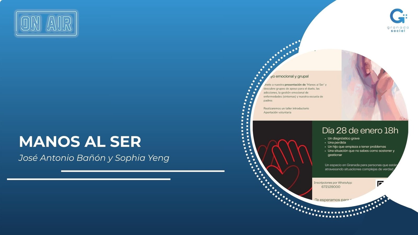 Granada Social ha estrenado una nueva sección radiofónica con una propuesta profundamente humana: Manos al Ser, una asociación recién creada por José Antonio Bañón y Sophia Yeng que nace con el objetivo de acompañar a personas que atraviesan momentos vitales complejos desde una mirada emocional, cercana y sin juicios.